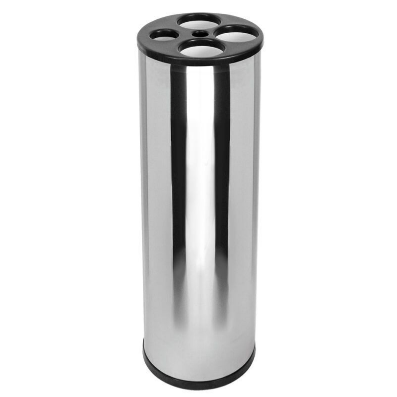 Confeccionado em aço inoxidável AISI 430, com fundo em plástico ABS e tampa injetada em plástico polipropileno (PP), possui tubo interno extrusado em plástico poliestireno (PSAI) para copos de água (180/200mL), 1 (um) para copos de café (50mL) e 1 (um) para descarte de palhetas usadas.