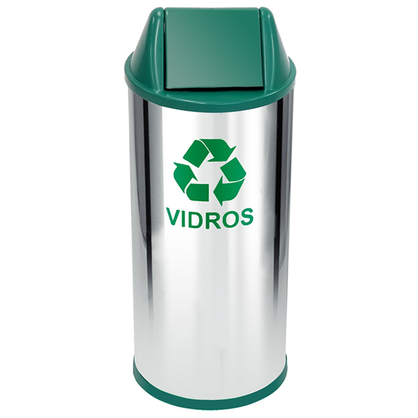 Lixeira confeccionada em aço inoxidável AISI 430, fundo em plástico ABS de alta resistência e tampa vai – vem plástica injetada em polipropileno (PP).