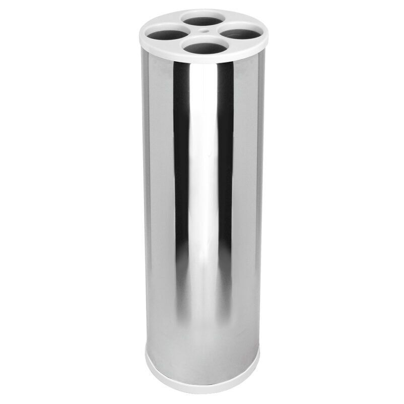 Confeccionado em aço inoxidável AISI 430, com fundo em plástico ABS e tampa injetada em plástico polipropileno (PP), tubos internos extrusado em poliestireno (PSAI) sendo 4 (quatro) tubos para copos de água e 1 (um) para descarte de palhetas usadas.